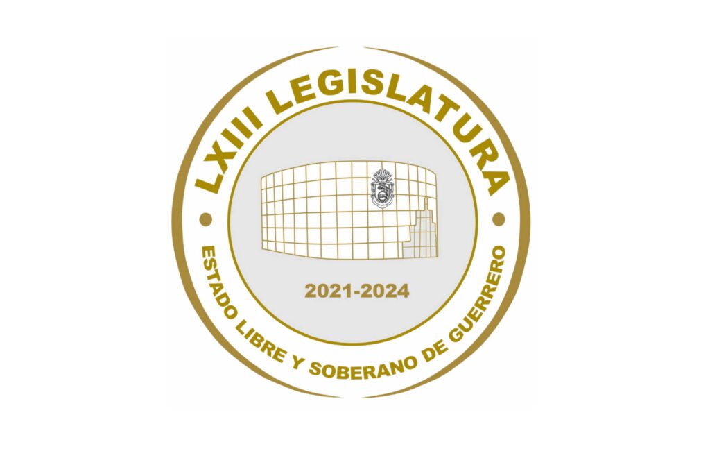 En la parte superior la leyenda LXIII Legislatura en fuente número 53 en mayúsculas; en los extremos en la parte central pequeños círculos; en la parte inferior la leyenda Estado Libre y Soberano de Guerrero con fuente en mayúsculas; en el centro una circunferencia con contorno en color general y relleno en color gris RGB 230, 230, 230; en su interior en la parte central el edificio del Congreso con relleno blanco; en la parte superior ligeramente a la derecha el escudo del estado de Guerrero en color negro, y bajo el edificio la leyenda 2021-2024 en fuente número 42.