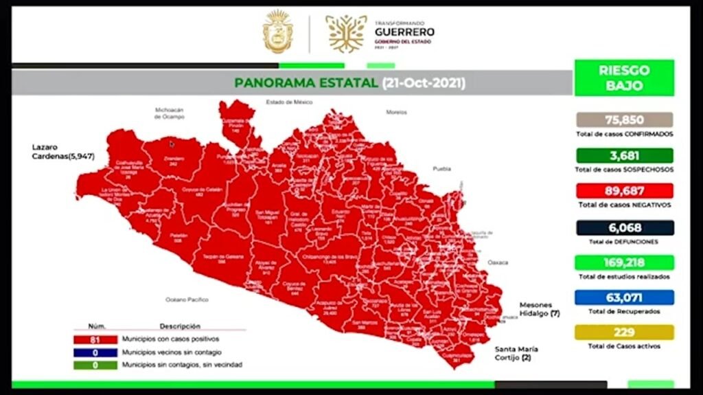 Por su parte, al dar a conocer el reporte diario sobre el Covid-19 en la entidad, el subsecretario de Prevención y Control de Epidemiologia, Jesús Ulises Adame Reyna, señaló que en la semana epidemiológica número 42, el estado de Guerrero continúa en color verde, registrando 55 casos nuevos en las últimas 24 horas y 229 casos activos, de los cuales 44 se ubican en Acapulco, 37 en Iguala, 31 en Taxco, 17 en Chilpancingo y 12 en Zihuatanejo.