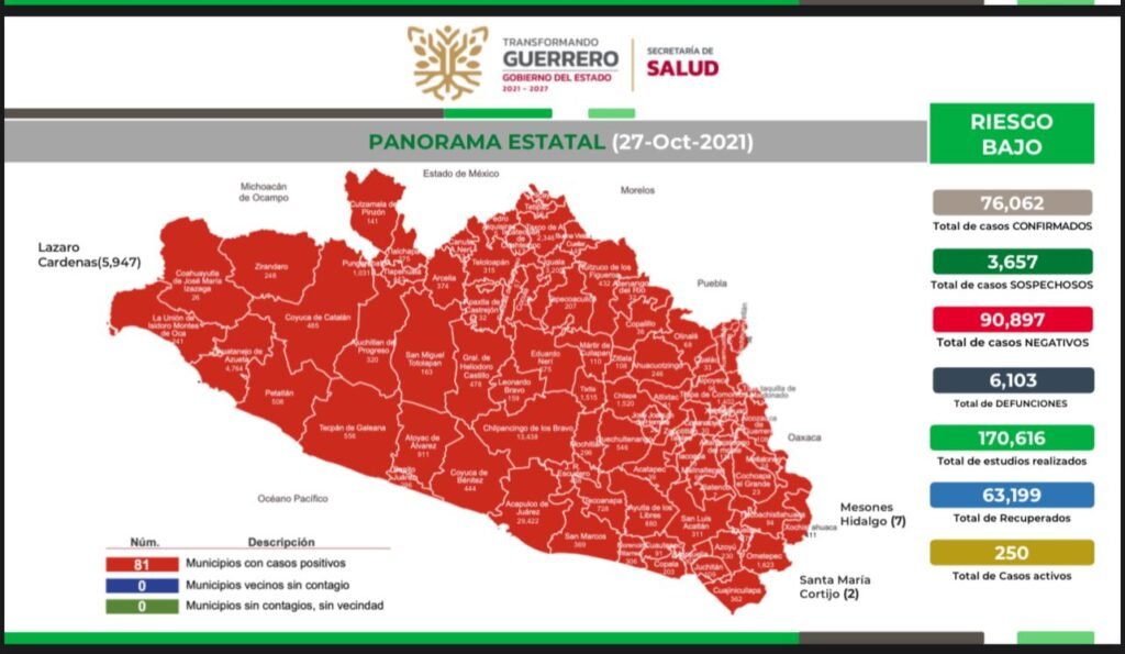 La Secretaría de Salud informa que de acuerdo a la evolución diaria de Covid-19 en el estado, en la semana epidémica 43, Guerrero continúa en color verde, registrándose en las últimas 24 horas 40 casos nuevos confirmados y 250 casos activos.