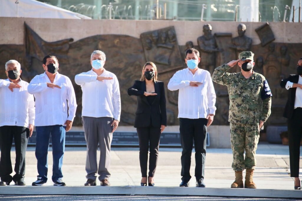 Con los representantes del Poder Legislativo y Judicial en el Estado, acompañada por el Senador Félix Salgado Macedonio, así como de mandos de la Novena Región Militar y de la Octava Región Naval, la gobernadora Evelyn Salgado Pineda izó el estandarte hasta lo más alto del asta monumental al centro de la sede del Poder Ejecutivo del Estado.