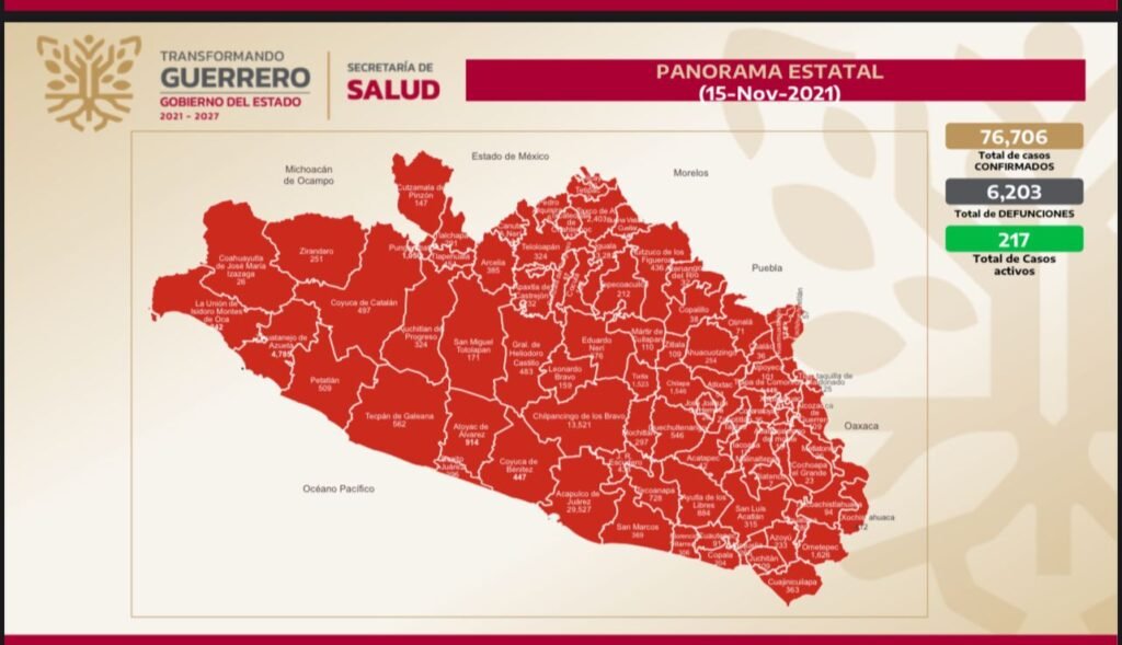 Asimismo, da a conocer que en las últimas 24 horas se registraron sólo seis casos nuevos y 217 casos activos, de los cuales Acapulco presenta 55, Iguala 30, Taxco 30 y Chilpancingo 23.