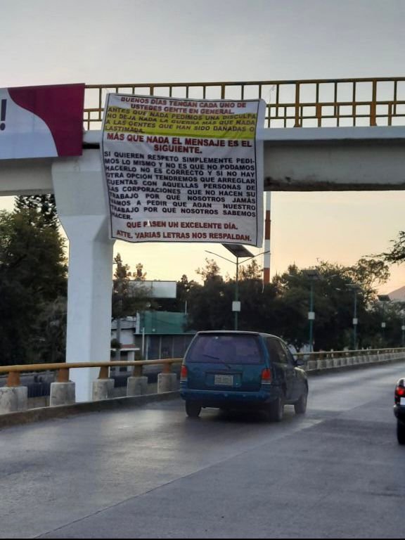 De acuerdo con información de ciudadanos, en Iguala fue colgada una lona en la entrada a la colonia Américas I y en la Ruffo Figueroa, mientras que en la capital, una de estas fue colgada en el puente peatonal de la colonia López Portillo, sobre el boulevard Vicente Guerrero que forma parte de la autopista del Sol.