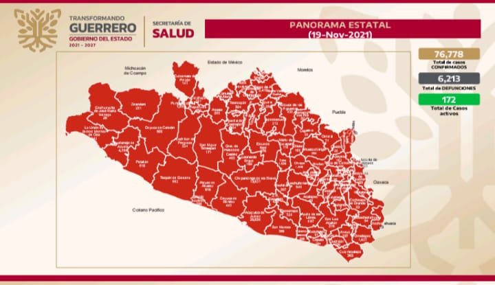 De acuerdo a los datos de la dependencia señalan que en esta semana epidemiológica número 46, se tienen 76.778 casos positivos y 6,213 defunciones acumuladas, y que en las últimas 24 horas se registraron únicamente 31 casos, en tanto que se tiene registro de 172 casos activos que se ubican, principalmente, en los municipios de Acapulco, Chilpancingo, Iguala, Taxco y Tlapa.