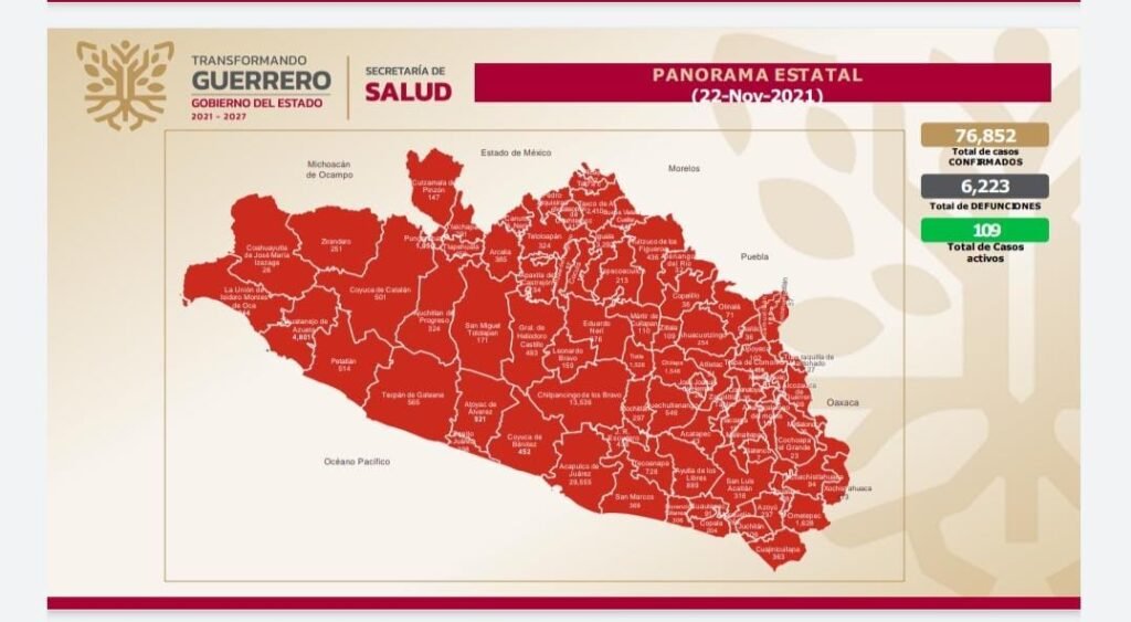 El informe detalla que desde el inicio de la pandemia, en Guerrero se han acumulado 76,852 casos confirmados y 6,223 defunciones a causa del Covid-19 y que de los 109 casos activos, 33 se ubican en el municipio de Acapulco; 15 en Chilpancingo; 12 en Iguala; 8 en Tlapa; 7 en Taxco; 5 en Tixtla; 4 en Coyuca de Catalán; 4 en Zihuatanejo; 3 en Azoyú; 2 en Ayutla de los Libres; 2 en Ometepec; 2 en Huamuxtitlán; 2 en Tlalixtaquilla.