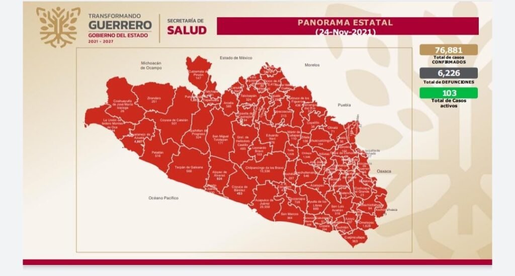 Desde el inicio de la pandemia, en Guerrero se acumulan 76,881 casos confirmados y 6,226 defunciones a causa del Covid-19, de acuerdo con el informe que actualiza diariamente la dependencia.