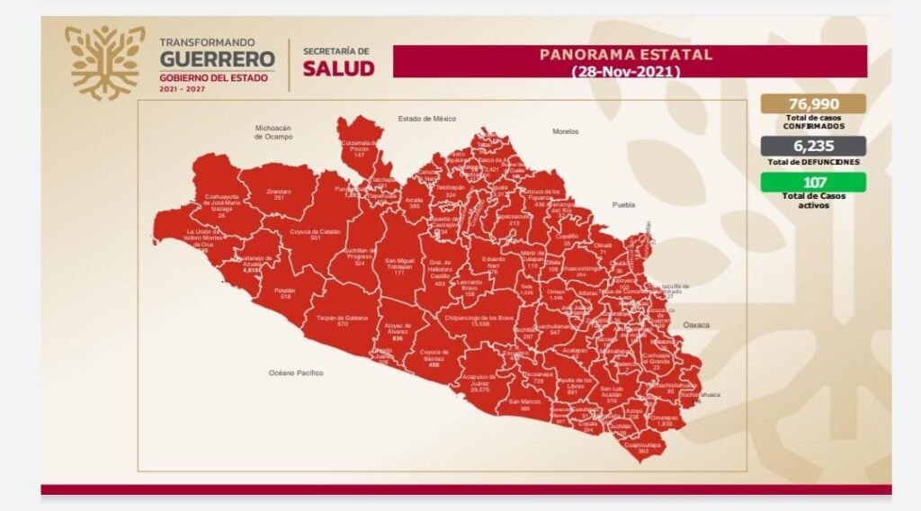 Desde el inicio de la pandemia, en Guerrero se acumulan 76,990 casos confirmados y 6,235 defunciones a causa del Covid-19, de acuerdo con el informe que actualiza diariamente Salud estatal.