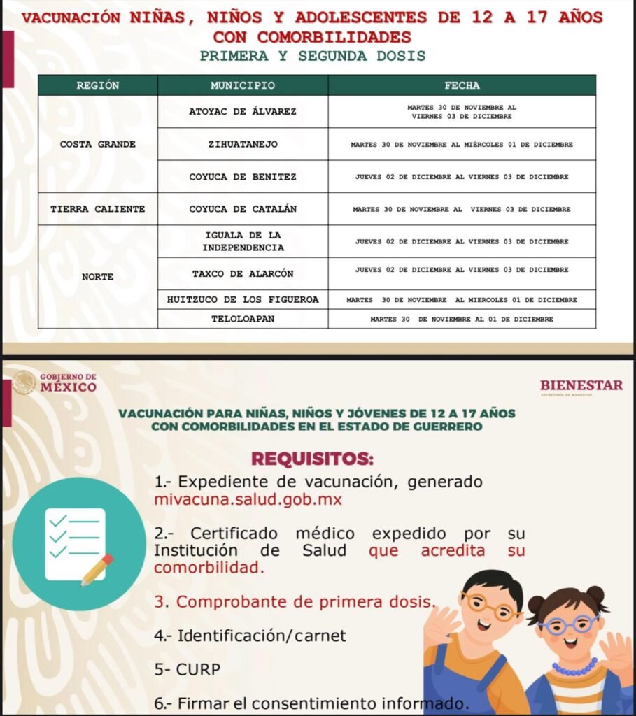 El delegado del gobierno federal en Guerrero, Iván Hernández Díaz, dio a conocer que en Atoyac se vacunará del martes 30 de noviembre al viernes 3 de diciembre; en Zihuatanejo del martes 30 de noviembre al miércoles 1 de diciembre; en Coyuca de Benítez del jueves 2 de diciembre al viernes 3 de diciembre; en Coyuca de Catalán del martes 30 de noviembre al viernes 3 de diciembre.