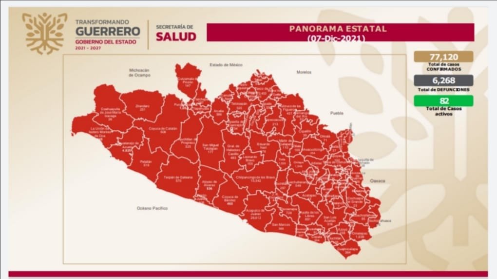 Los 82 casos activos se concentran principalmente en los siguientes municipios: Acapulco de Juárez, 24; Iguala de la Independencia, 14; Taxco de Alarcón, 7; Chilpancingo de los Bravo, 5; Cocula, 5; Tlapa de Comonfort, 5; Zihuatanejo de Azueta, 5; Ometepec, 4; Ajuchitlán del Progreso, 1; y Atlixtac, 1.