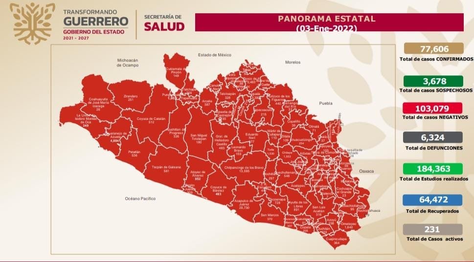 Desde el inicio de la pandemia, en Guerrero se acumulan 77,606 casos confirmados y 6,324 defunciones a causa del COVID-19, de acuerdo con el informe “COVID-19 Guerrero”, que actualiza diariamente Salud estatal.