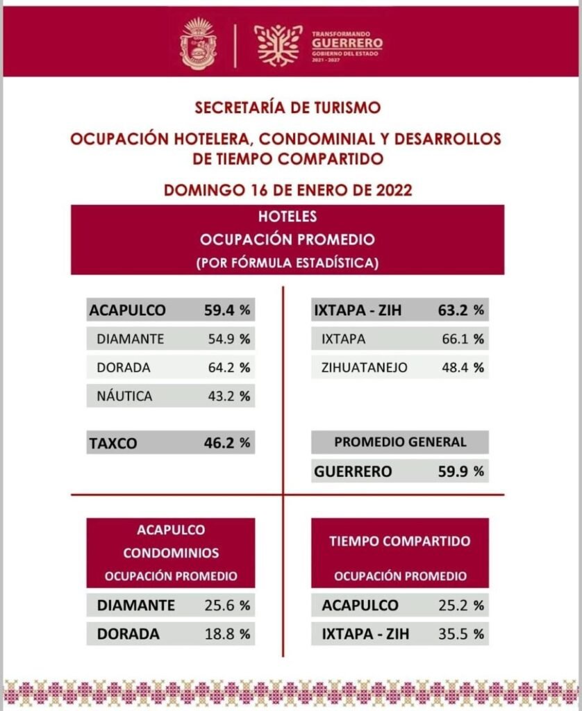 De manera individual, Ixtapa promedia 66.1 y Zihuatanejo 48.4 por ciento. De acuerdo con las cifras oficiales, la ciudad colonial de Taxco reportó el 46.2 por ciento de cuartos ocupados. Con estas cifras, el estado de Guerrero tuvo una ocupación del 59.9 puntos. En lo que respecta a la oferta de condominios eh Acapulco, la zona Diamante registró el 25.6 por ciento y la Dorada 18.8 por ciento.