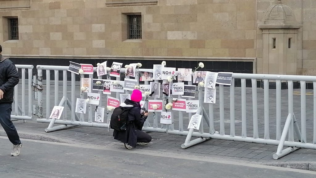 La mañana de este martes, periodistas protestaron afuera de Palacio Nacional, en la ciudad de México, con un memorial a sus colegas asesinados.