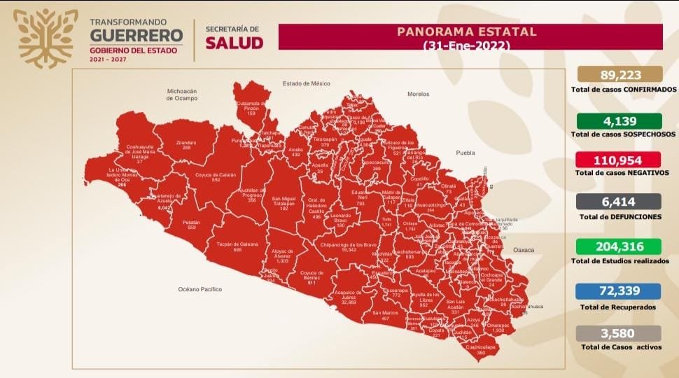 Los 3,580 casos activos se concentran principalmente en los siguientes municipios: Chilpancingo de los Bravo, 1,031; Zihuatanejo de Azueta, 438; Acapulco de Juárez, 426; Tlapa de Comonfort, 329; Taxco de Alarcón, 216; Iguala de la Independencia, 189; Ometepec, 159; Chilapa de Álvarez, 131; Tixtla de Guerrero, 82; y Eduardo Neri, 47.