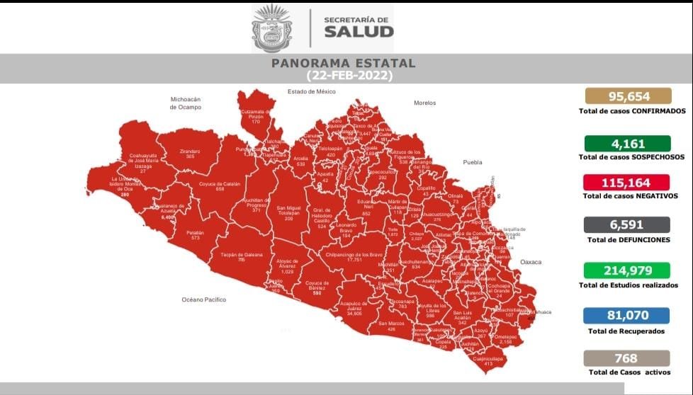 Desde el inicio de la pandemia, en Guerrero se acumulan 95,654 casos confirmados y 6,591 defunciones a causa del COVID-19, de acuerdo con el informe “COVID-19 Guerrero”, que actualiza diariamente Salud estatal.