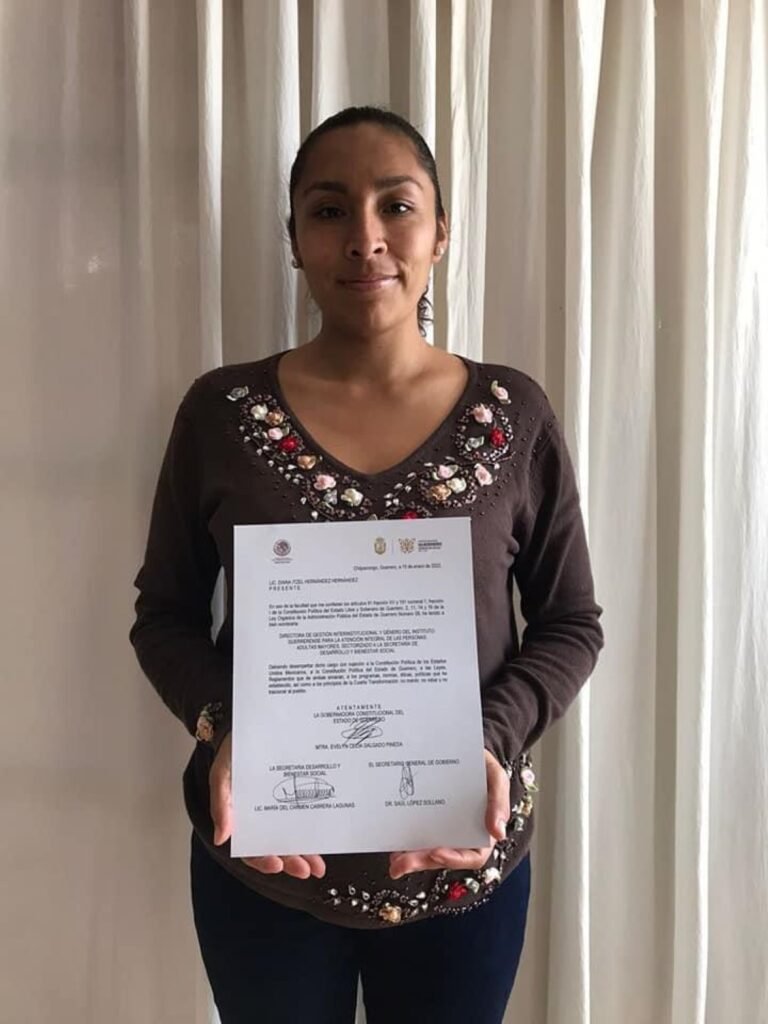 Diana Hernández, hija del luchador social Ranferi Hernández Acevedo, fue nombrada directora de Gestión Interinstitucional y de Género del Instituto Guerrerense para la Atención Integral de las Personas Adultas Mayores (IGATIPAM).