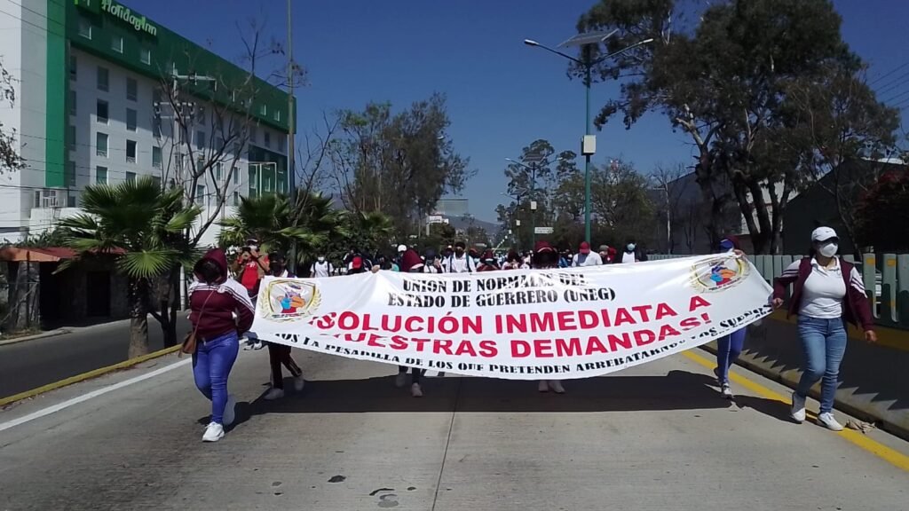 Estudiantes aglutinados a la Unión de Normales del Estado de Guerrero (UNEG) marcharon sobre el bulevar Vicente Guerrero, para exigir una audiencia con la gobernadora Evelyn Salgado Pineda.