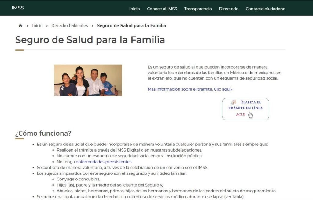 En un comunicado, la Jefatura de Servicios de Afiliación Cobranza del instituto señaló que la población puede hacer el trámite en línea a través del portal http://www.imss.gob.mx/derechoH/segurosalud-familia, donde además podrá consultar costos.