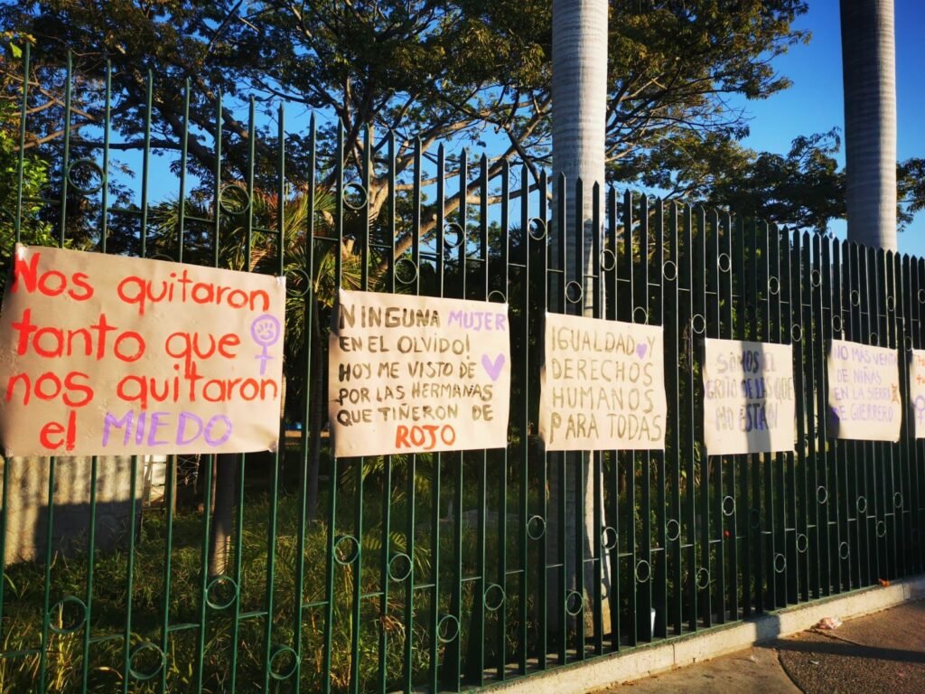 Las mujeres dejaron cartulinas con leyendas a favor del movimiento de igualdad de género, colocadas en las mallas del Parque Papagayo, espacio público que recientemente fue remodelado.