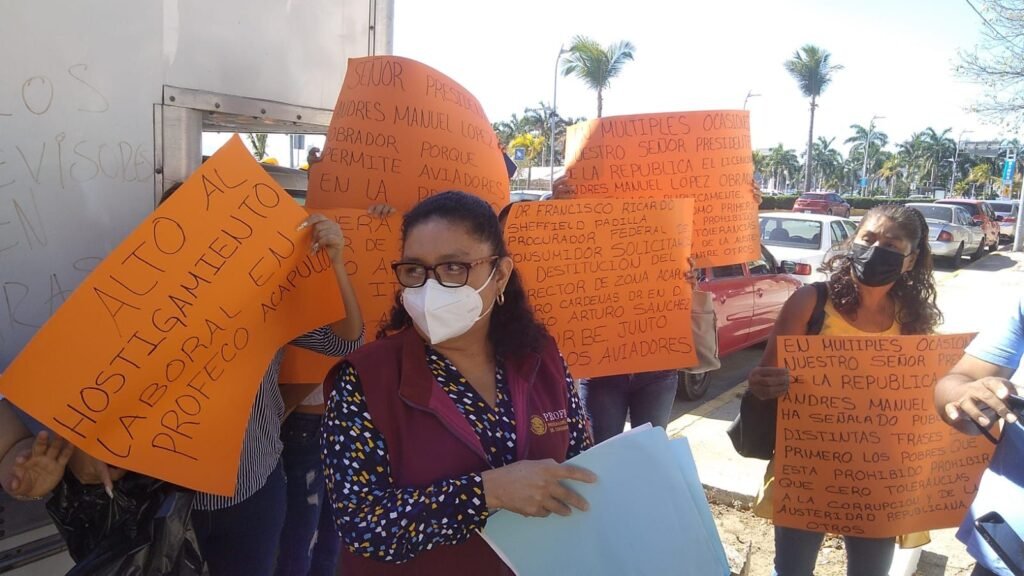 Trabajadores de la Procuraduría Federal del Consumidor (Profeco) protestaron afuera de las oficinas de la delegación en Acapulco, para denunciar actos de acoso laboral por parte del titular, Sergio Arturo Sánchez Iturbe.