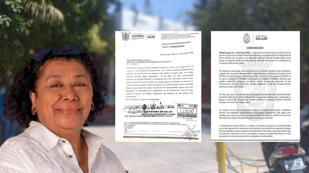 De acuerdo con un oficio, la subdirectora de Recursos Humanos de la dependencia, Micaela Manzano Martínez, designó a América Rosales para que sustituya a su madre Aidé Ibarez en la base laboral que esta última tiene en la Jurisdicción Sanitaria 7 con sede en Acapulco.