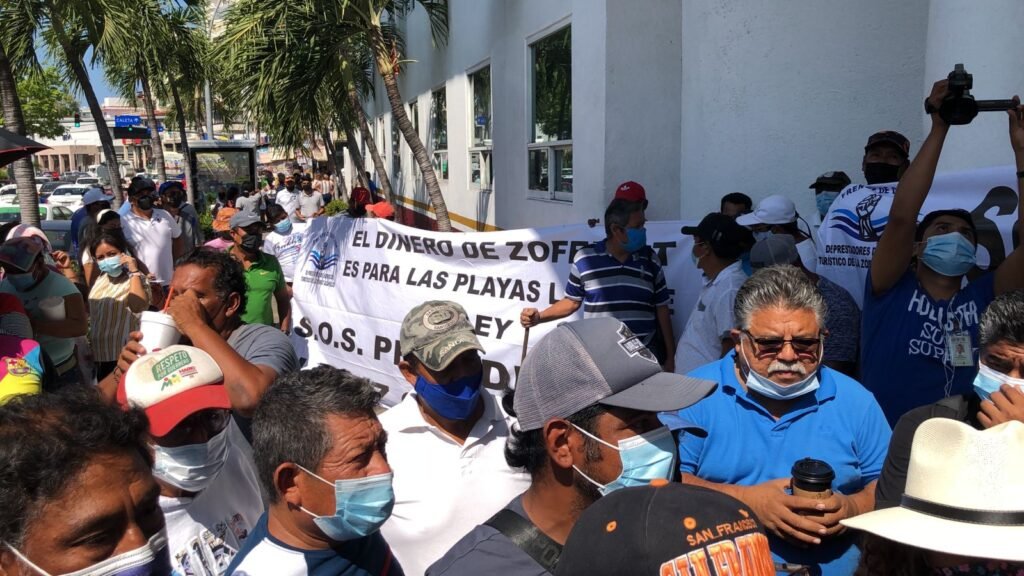 Con lonas en las manos, los alrededores de 50 prestadores de servicios turísticos protestaron para pedir que se apliquen los recursos federales para el mantenimiento y conservación de las playas.