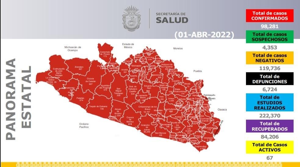 Asimismo, destacó que a nivel nacional se registran 8,612 casos activos, y que los 67 que existen en Guerrero se ubican, principalmente, en los municipios de Acapulco, con 17; Iguala, 17; Chilpancingo, 10; Taxco, 7; Chilapa, 5; Coyuca de Catalán, 3; Buenavista de Cuéllar y Teloloapan, 2, y Alpoyeca, y Cuautepec, 1 cada uno.