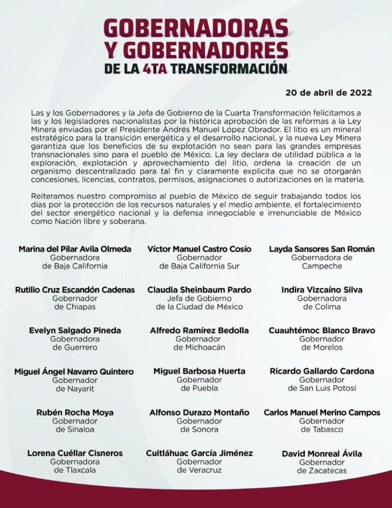 En el desplegado los gobernadores señalan que el litio “es un mineral estratégico para la transición energética y el desarrollo nacional; la nueva Ley Minera garantiza que los beneficios de su explotación no sean para las grandes empresas transnacionales, sino para el pueblo de México”.