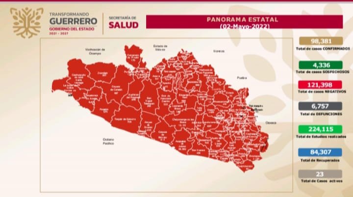 Al 01 de mayo, el Estado de Guerrero concentra 23 casos activos, en seis municipios: Acapulco con 12; Chilpancingo, 6; Taxco, 2; Chilapa, 1; Iguala, 1 y Huitzuco,1. El informe indica que en las últimas 24 horas se registró 1 nuevo caso de COVID-19 en la entidad, correspondiente al mes de abril.