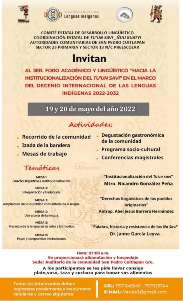 Además se realizarán las conferencias magistrales de “La institucionalización del Tu’un Savi” del profesor, Nicandro González Peña; “Derechos lingüísticos de los pueblos originarios” del antropólogo, Abel Barrera Hernández; “Palabra, historia y resistencia de los Na Savi” que ofrecerá García Leyva.