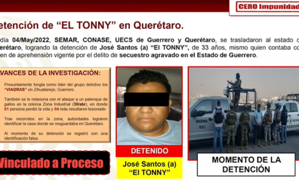 En la conferencia de prensa matutina del presidente de la República, Andrés Manuel López Obrador, el subsecretario de Seguridad federal, Ricardo Mejía Berdeja, informó que la captura de José N., alias “El Tonny”, de 33 años, ocurrió el pasado 4 de mayo y ya se le vinculó a proceso.