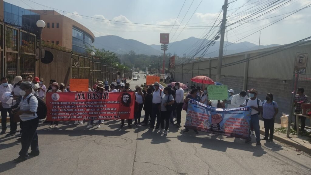 Un grupo de integrantes del Movimiento de Trabajadores Precarios de Salud del Estado de Guerrero, realizaron una protesta a un costado de Palacio de Gobierno para denunciar que a 200 de sus compañeros no les renovaron sus contratos eventuales y exigieron un diálogo directo con la gobernadora, Evelyn Salgado Pineda.
