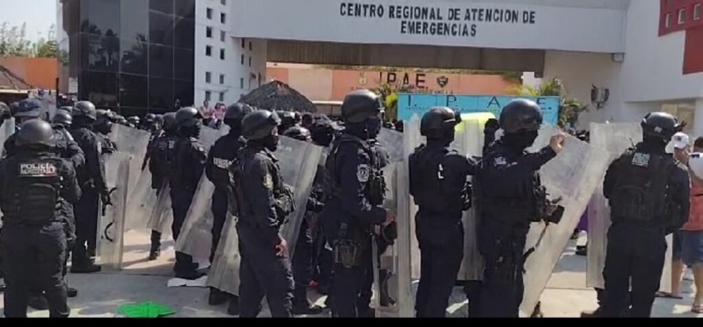 Policías antimotines desalojaron a elementos de la policía auxiliar que bloqueaban el bulevar de Las Naciones, en la zona Diamante de Acapulco.