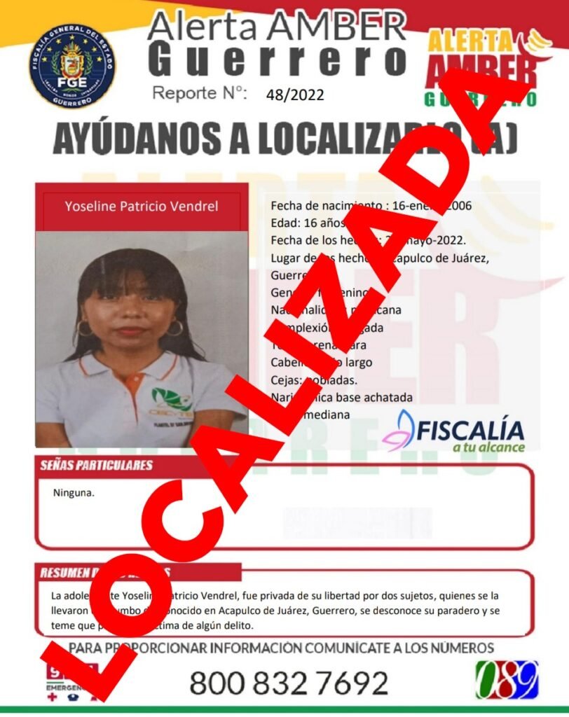 La menor Joseline Patricio Vendrel fue localizada este domingo y ya se encuentra con su familia, después de que el viernes fue plagiada por hombres armados en San Agustín, Acapulco.