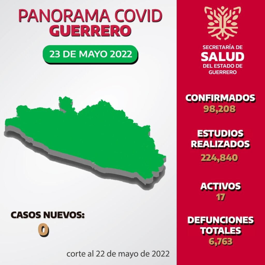 La dependencia estatal destacó que de acuerdo con el informe “Covid-19 Guerrero”, desde el inicio de la pandemia, en la entidad se acumulan 98,208 casos confirmados y 6,763 defunciones, y que hoy se contabilizan 17 casos activos, en los municipios de Acapulco, con 7; Chilpancingo, 3; Chilapa, 2, y La Unión, Técpan, Tlapa, Tlapehuala y Zihuatanejo, con 1 cada uno.