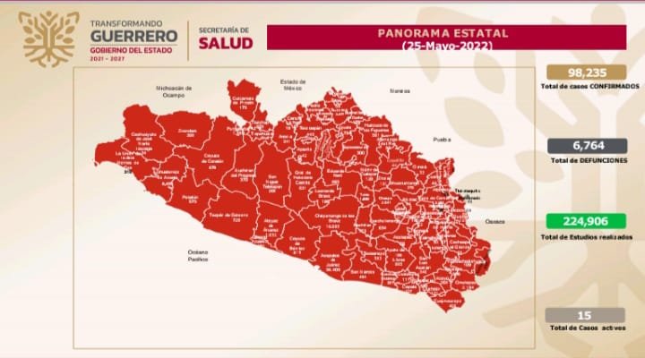 Agregó que desde el inicio de la pandemia, en Guerrero se acumulan 98,235 casos confirmados por Covid-19, y que al día de hoy se tienen 15 casos activos en los municipios de Acapulco, con 6; Chilpancingo y Chilapa con 2 cada uno, y La Unión, Tecpan, Tlapa, Tlapehuala y Zihuatanejo, con 1 cada uno.