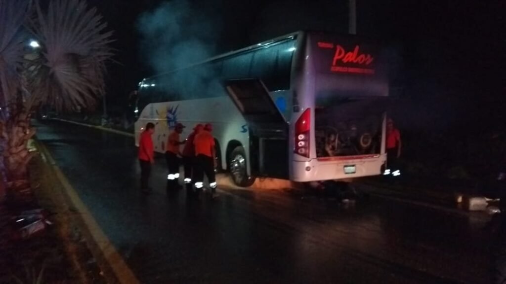 Un autobús de turismo que viajaba de Acapulco a Ometepec y que transportaba a personas de la tercera edad, comenzó a incendiársele el motor; por fortuna no hubo personas heridas.