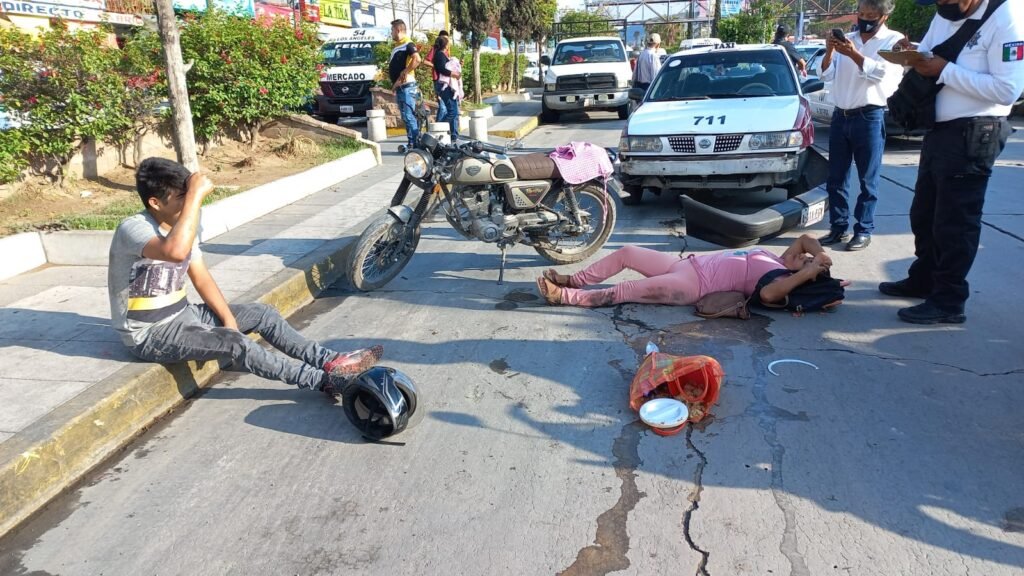 Un hombre y una mujer que se desplazaban a bordo de una motocicleta, resultaron con lesiones de consideración luego de ser impactados por un automóvil del servicio público, en los carriles de circulación de norte a sur, de la avenida Insurgentes, justo frente al mercado BRLM.