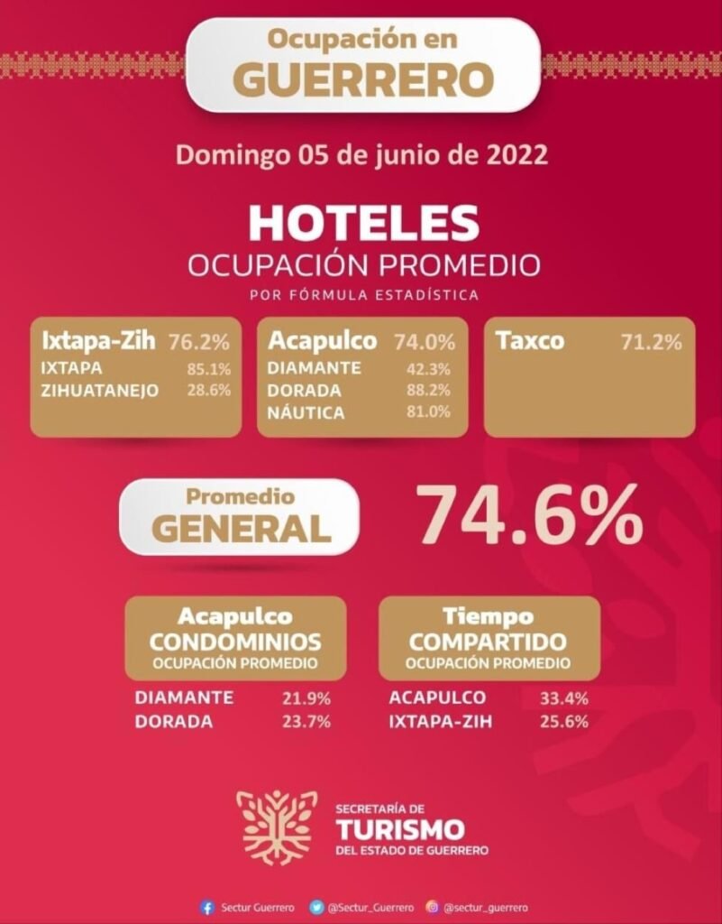 Los destinos turísticos del estado de Guerrero reportaron este primer domingo de junio un promedio general de ocupación hotelera del 66.2 por ciento.