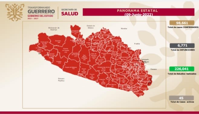 Se informó que, desde el inicio de la pandemia, en Guerrero se acumulan 98,661 casos confirmados y 6,771 defunciones a causa del Covid-19, de acuerdo con el informe que actualiza diariamente la Secretaría de Salud estatal.