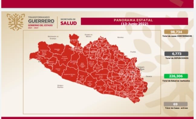 Asimismo, señaló que desde el inicio de la pandemia, en Guerrero se acumulan 98,734 casos confirmados y 6,773 defunciones por esta causa, destacando que el estado de Guerrero se ubica en el lugar 31 a nivel nacional en casos activos, con 69, confirmando una ocupación de camas para la atención de pacientes Covid del 4 por ciento.