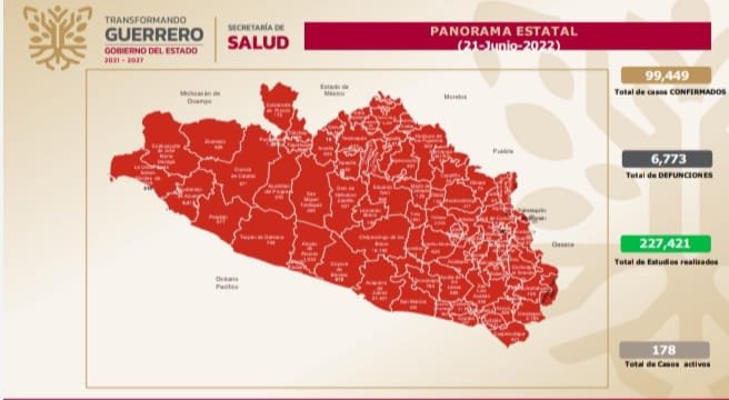 Al corte del 20 de junio del presente año, el estado de Guerrero se mantiene en color verde del semáforo de riesgo epidemiológico con 178 casos activos de Covid-19, de los cuales 13 se confirmaron en las últimas 24 horas, ubicándose en el lugar número 30 a nivel nacional en este rubro.