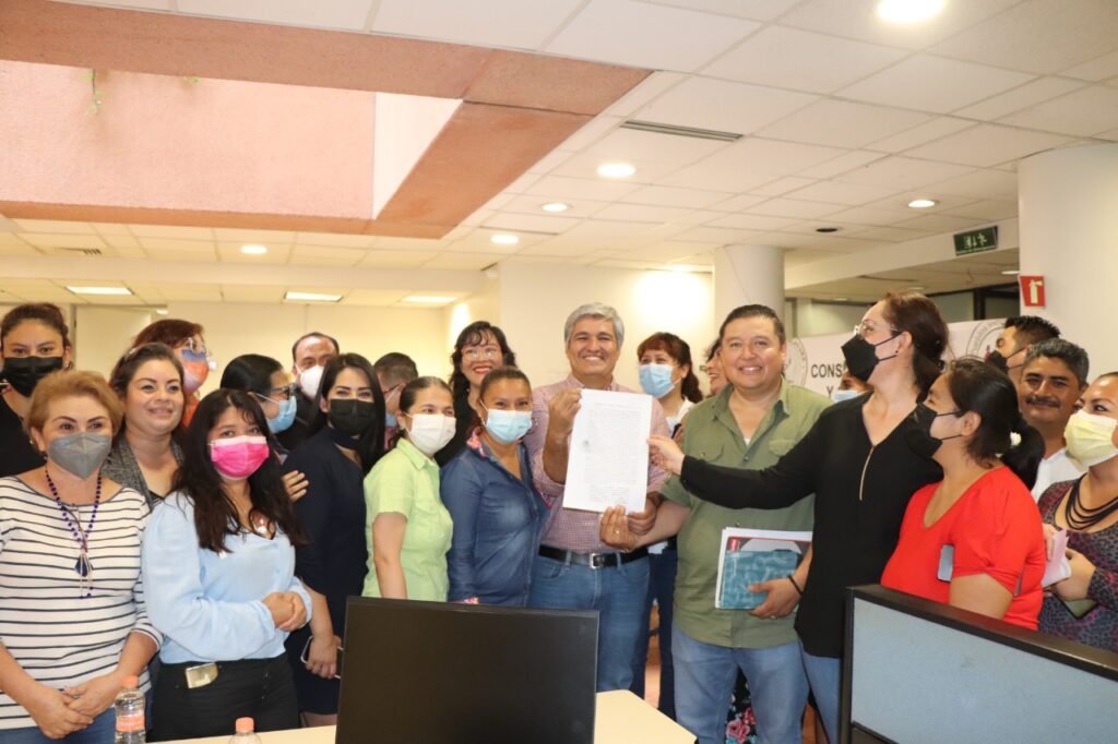 Integrantes del sindicato de nueva creación “Sentimientos de la Nación” del Congreso del Estado se reunieron con el diputado, Alfredo Sánchez Esquivel, presidente de la Junta de Coordinación Política, a quien entregaron los documentos que acreditan la toma de nota y registro otorgado por el Tribunal de Conciliación y Arbitraje del Estado de Guerrero.