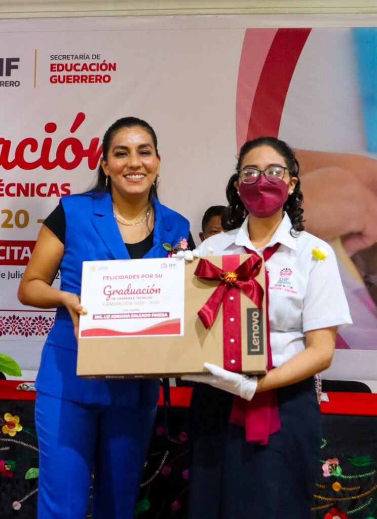 Al acudir como madrina de generación de las estudiantes egresadas de los Cecaps, la presidenta del DIF Guerrero entregó a las egresadas máquinas industriales para corte y confección; laptops para las que concluyeron sus estudios de computación; y kits de belleza para las que egresaron de la carrera técnica de cultora de belleza, donde se destacó que la generación de graduadas este 2022, es la primera que en más de cuarenta años, egresan con el título de Técnicas en las carreras de Corte y confección, Cultora de belleza, Computación y Secretariado, lo que eleva el rango académico y profesional de las alumnas.