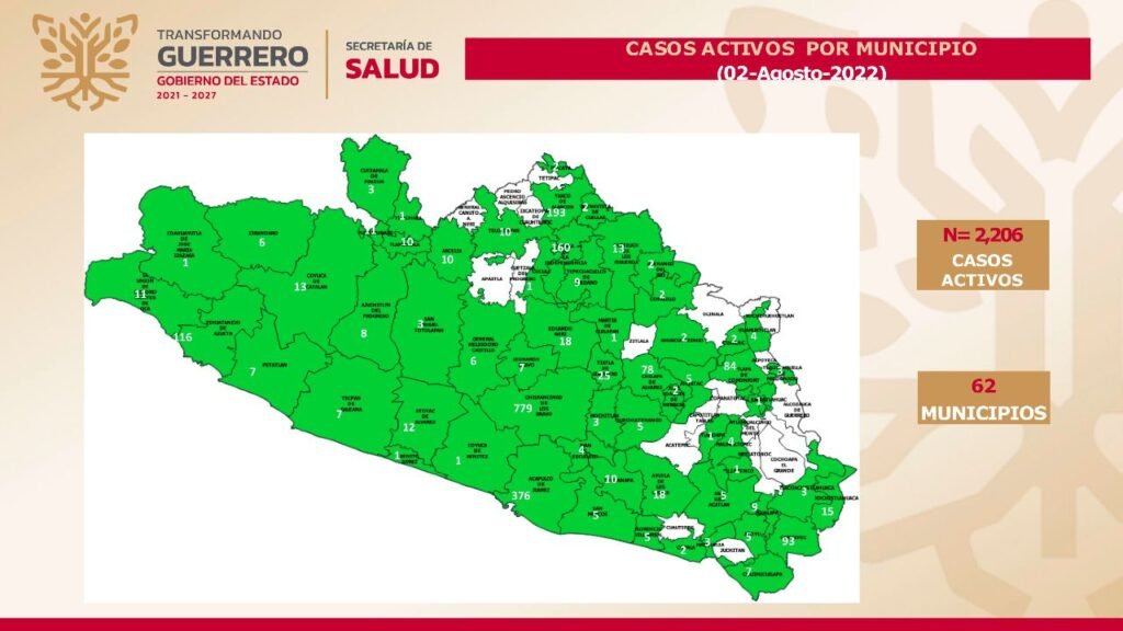 Esos casos se ubican en 62 municipios del estado, entre los que destacan Chilpancingo con 779; Acapulco, 376; Taxco, 193; Iguala,160; Zihuatanejo, 116; Ometepec, 93; Tlapa, 84; Chilapa, 78; Tixtla,25; y Ayutla de los Libres, 18. Desde el inicio de la pandemia, la entidad acumula 112 mil 009 casos confirmados y 6 mil 800 defunciones por Covid-19.En lo que respecta al porcentaje de ocupación de camas para atención a pacientes por la pandemia, indicó que es del 21 por cierto.