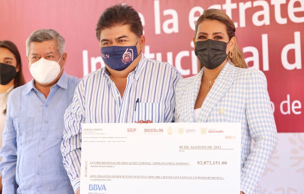 La mandataria estatal encabezó la entrega de recursos económicos para el desarrollo institucional de las 9 Escuelas Normales y 3 Centros de Actualización del Magisterio (CAM) de Guerrero