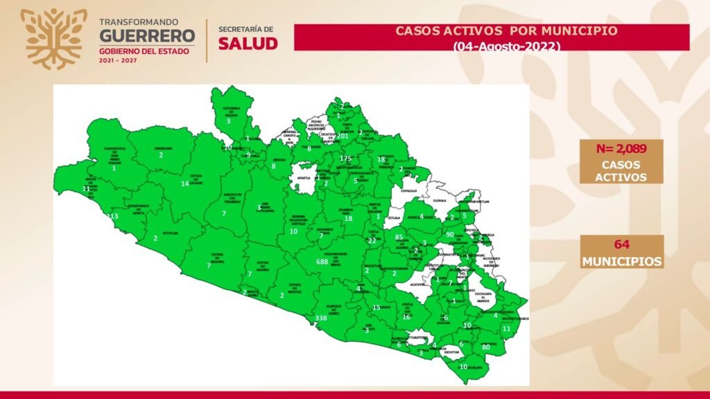 A nivel nacional, la entidad se ubica en el lugar 23 en casos activos, que se concentran en 64 municipios, entre ellos Chilpancingo, con 688; Acapulco, 338; Taxco, 201; Iguala, 175; Zihuatanejo, 113; Tlapa, 90; Chilapa, 85; Ometepec, 80; Tixtla, 22, y Eduardo Neri, 18.Tras indicar que la ocupación de camas para la atención de pacientes Covid es del 24 por ciento, la Secretaría de Salud reiteró su llamado a la población a continuar con las medidas preventivas como el uso correcto de cubrebocas, mantener la sana distancia de 1.5 metros, ventilar espacios cerrados, lavado de manos constante con agua y jabón, y evitar aglomeraciones.