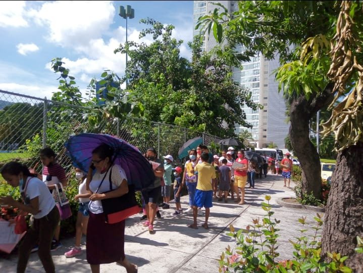 En el módulo del Centro Internacional Acapulco (CIA) hubo una larga fila de niños y padres de familia formados, con gorras y sombrillas para cubrirse del sol.