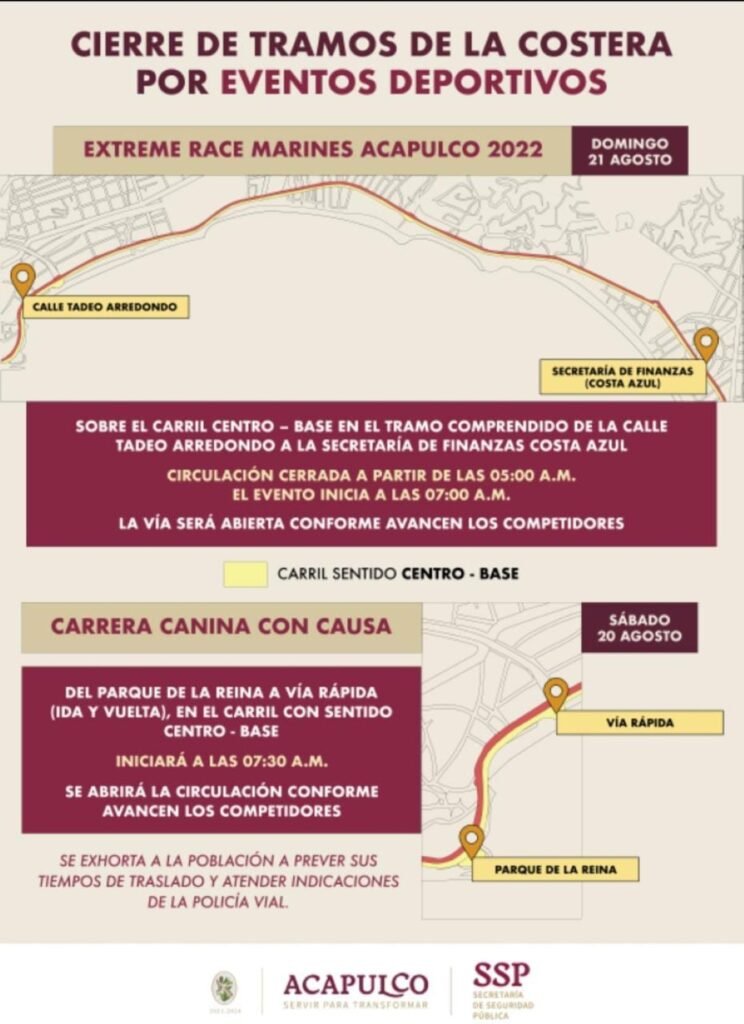 Para el domingo se prevé el “Extreme Race Marines Acapulco 2022”, sobre el carril Centro – Base en el tramo comprendido de la calle Tadeo Arredondo a la Secretaría de Finanzas Costa Azul, la circulación quedará cerrada a partir de las 5 horas, para el montaje de los obstáculos previo a la competencia; el evento iniciará a las 7 horas, la vía será abierta conforme avancen los competidores.Se recomienda a los conductores prever sus tiempos de traslado y atender los señalamientos e indicaciones de los elementos de la Policía Vial.