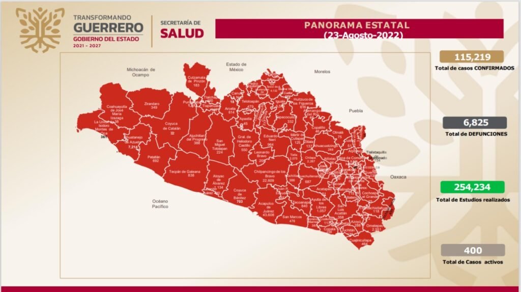 Agregó que desde el inicio de la epidemia, Guerrero acumula 115,219 casos confirmados y 6,825 defunciones, ubicándose en el lugar 26 a nivel nacional en incidencia de casos activos en 42 municipios, en especial Chilpancingo, con 120; Acapulco, 55; Iguala, 50; Taxco, 50; Chilapa, 14; Zihuatanejo, 14; Tlapa, 12; Arcelia, 8; Atlixtac, 8, y Huitzuco, 8.