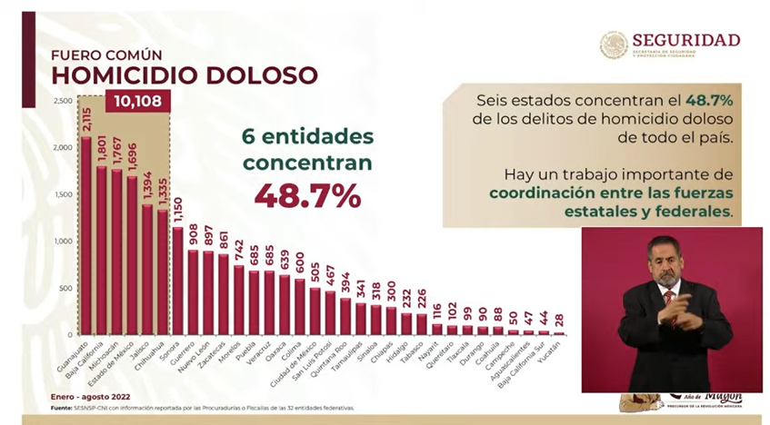 De acuerdo con el informe mensual dado a conocer este martes por la secretaria de Seguridad Pública federal, Rosa Icela Rodríguez Velázquez, seis estados concentran el 48.7 por ciento de los homicidios dolosos en el país, encabezados por Guanajuato con 2 mil 115 asesinatos, Baja California con mil 801, Michoacán con mil 767, Estado de México con mil 696, Jalisco con mil 394 y Chihuahua con mil 335 asesinatos dolosos.