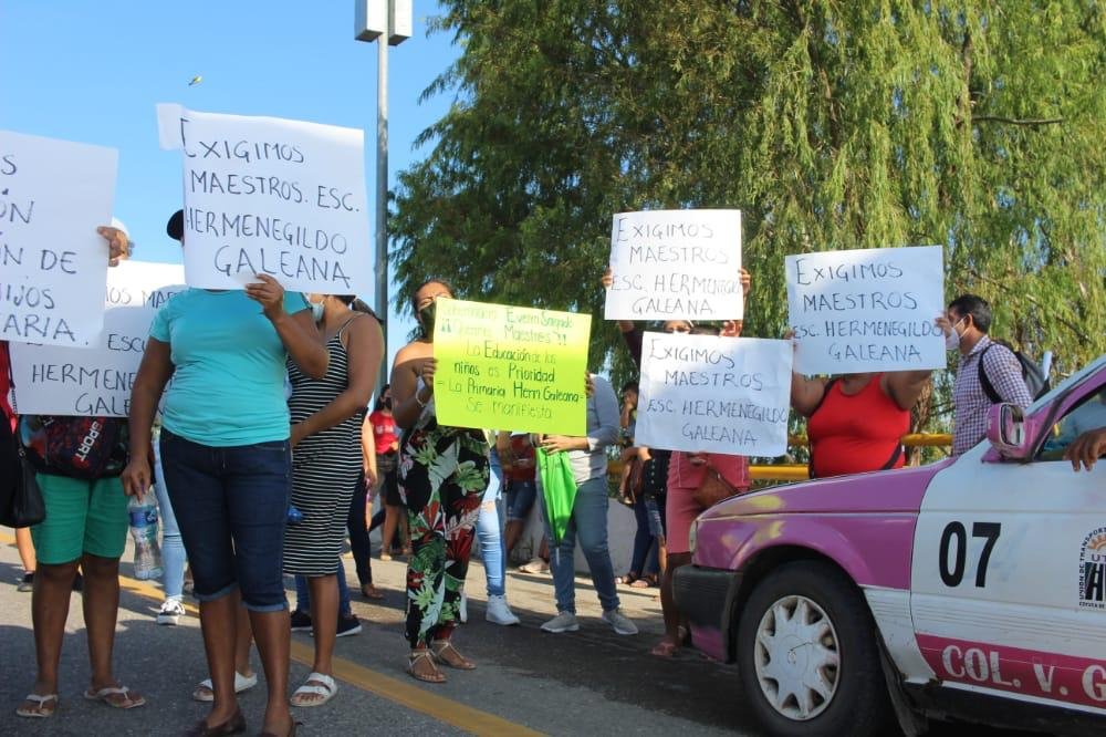 Padres de familia de la escuela primaria Hermenegildo Galeana, ubicada en Coyuca de Benítez, este jueves por la mañana llevaron a cabo una protesta, con un bloqueo a la carretera federal Acapulco-Zihuatanejo, a la altura del puente que une a esta cabecera municipal con el resto de la Costa Grande.